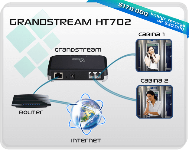 El Grandstream HT702 es una ATA (Adaptador telefónico analógico) que permite realizar hasta dos llamadas simultaneas (celulares, fijos nacionales e internacionales) a través de Internet. Excelente para cabinas telefónicas, empresas y uso personal.